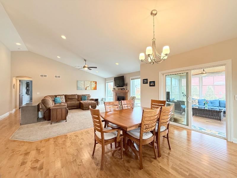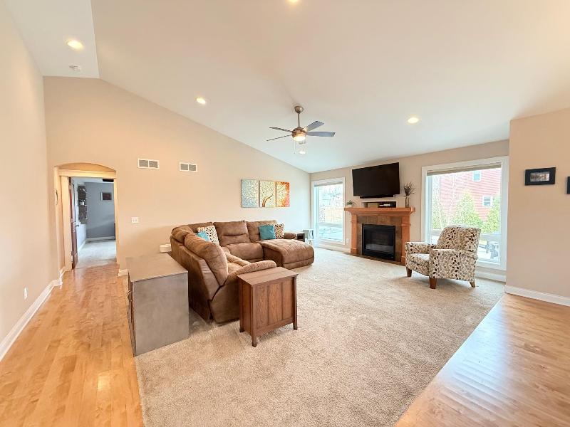 Immaculate & move in ready! This one owner custom built ranch offers over 2,600 sq ft, 4 bedrooms, 3 baths, great room with soaring ceilings, gas fireplace and large picture windows for natural light, spacious kitchen and dining area with stainless steel appliances, quartz countertops, island and pantry, owners suite with coffered ceiling, ensuite with dual vanities and walk-in closet. Exposed lower level with family room, rec room with wet bar, 4th bedroom, 3rd bath and tons of storage. Main level laundry and mudroom with custom built ins, plus 3 car garage with stairs to the lower level. Enjoy the summer evenings from your cozy 3 season porch or patio overlooking spectacular yard with mature trees. Just steps from the walk / bike path, Prairie Creek Conservation Area and blocks from Fireman’s Park. New roof 2025.
